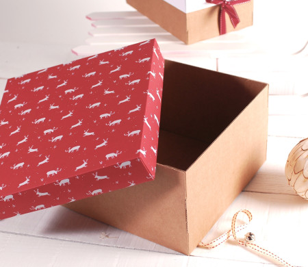 Divertiti impacchettando i tuoi regali con queste scatoline decorate di Natale. Una scatola con una base color kraft ed il coperchio bordeaux con le renne bianche. Che scatola originale! Aggiungi del nastro beige con dei puntini rossi e un campanellino.